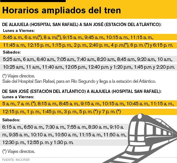 El tren hará 15 carreras desde Alajuela y 14 desde San José, la mayoría en horas valle (de menor demanda). También habrá viajes directos todos los días en ambos sentidos.