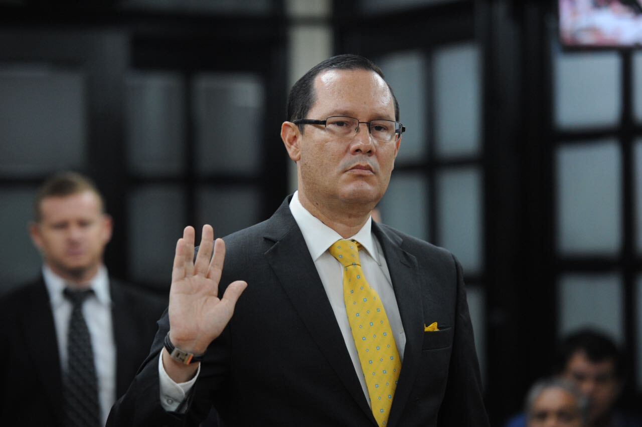 Momento en que el magistrado suspendido de la Sala Tercera, Celso Gamboa, jura decir la verdad ante las preguntas de los diputados de la Comisión Especial Investigadora de Créditos Bancarios. (Melissa Fernández)