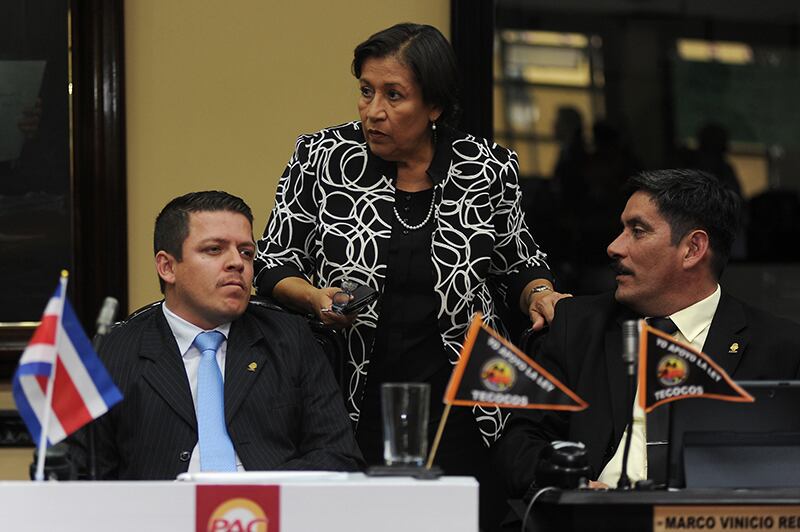 El diputado Marco Redondo (der.), del PAC, señala a Emilia Molina (centro) como una de las principales negociadoras de los acuerdos 'a espaldas' del resto de la fracción. Con ellos, Franklin Corella (izq.). (Rafael Murillo.)