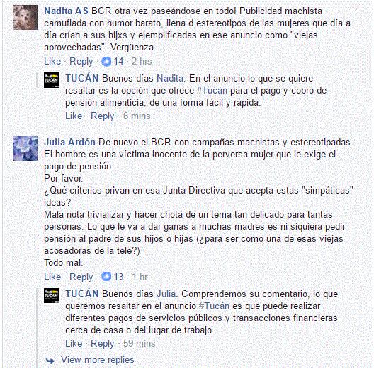 Mediante un comunicado, la administración del Banco reaccionó de la siguiente manera: "El Banco de Costa Rica manifiesta que bajo ninguna circunstancia pretende ofender a los hombres y mujeres que pagan o se benefician de las pensiones alimenticias. Todo lo contrario, se convierte en una alternativa accesible de servicios financieros, abrir cuentas, hacer pagos siempre y donde sea".