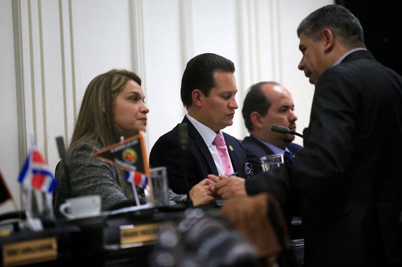 Karla Prendas, del PLN; Luis Vásquez, del PUSC, y Francisco Camacho, del Fa, conversaron ayer sobre el polémico reclamo contra la administración legislativa por el uso de vehículos oficiales para una gira de la Comisión de Turismo. | RAFAEL PACHECO. (Rafael PACHECO GRANADOS)