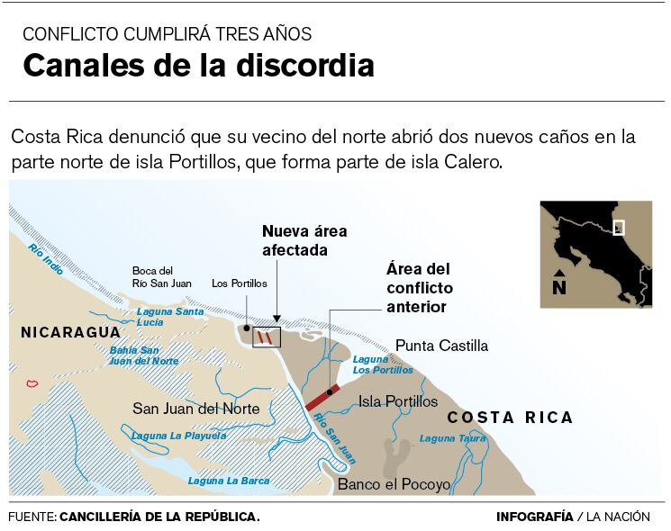 Los nuevos caños están a 2,6 kilómetros al norte del primer punto de invasión advertido por Costa Rica en octubre del 2010, dijo el abogado de la Cancillería, Sergio Ugalde.