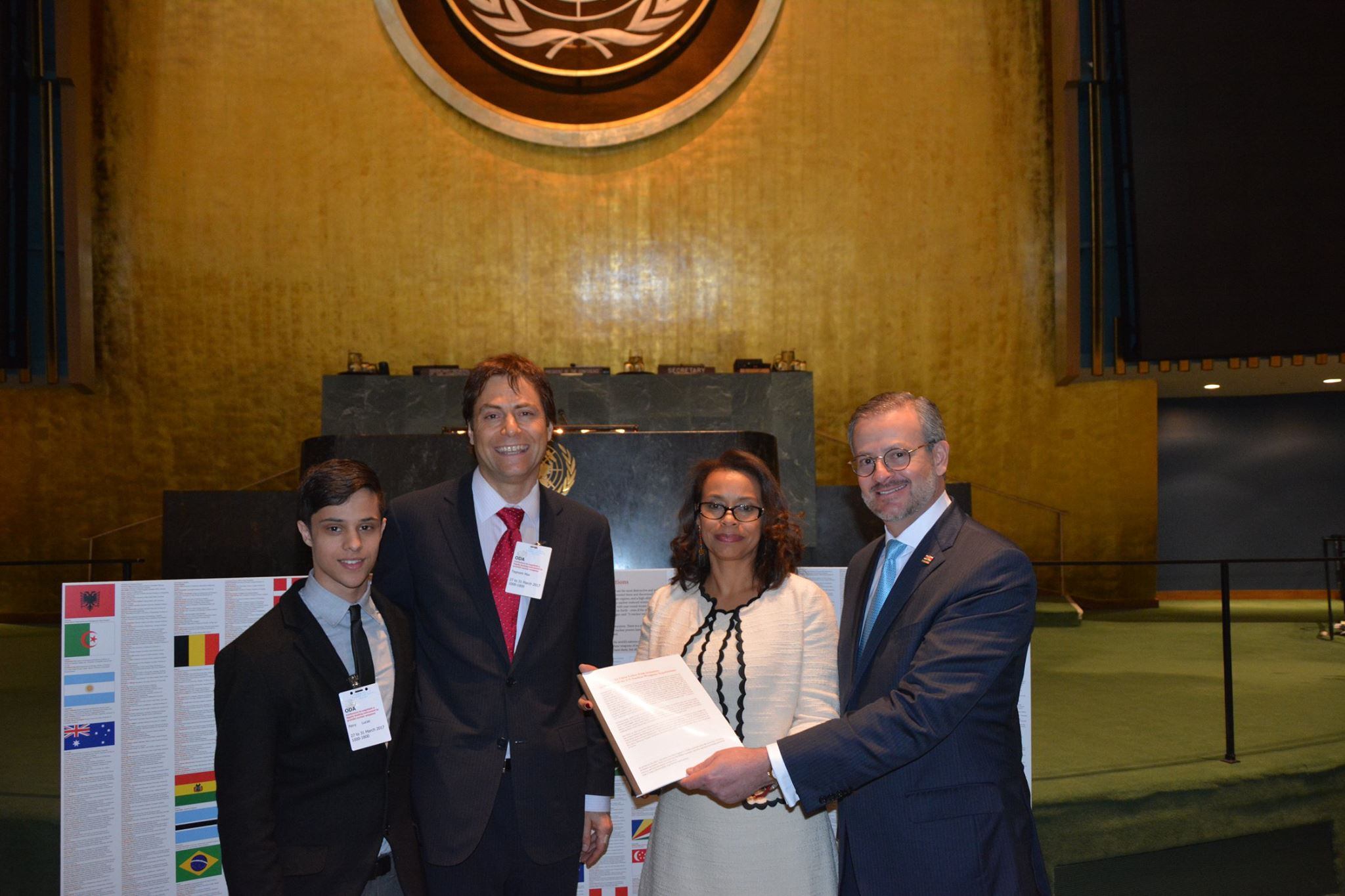 La embajadora de Costa Rica ante la ONU, Elayne Whyte, posa junto con el canciller, Manuel González (der.), y el científico Max Tegmark, quien entregó a la Conferencia que preside Whyte una carta abierta firmada por 3.000 científicos en favor de la prohibición del uso de armas atómicas. (Cortesía Elayne Whyte)