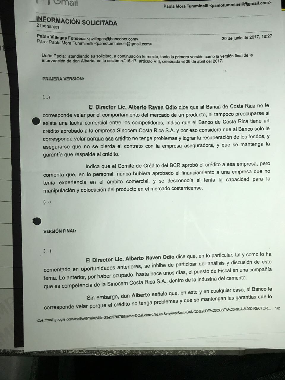 Ella dejó copia de un correo remitido el 30 de junio anterior por Pablo Villegas Fonseca, secretario de Actas del BCR, en el que confirma que existió una primera versión de lo que dijo Raven, diferente a la última, que fue la que él leyó ante los diputados.