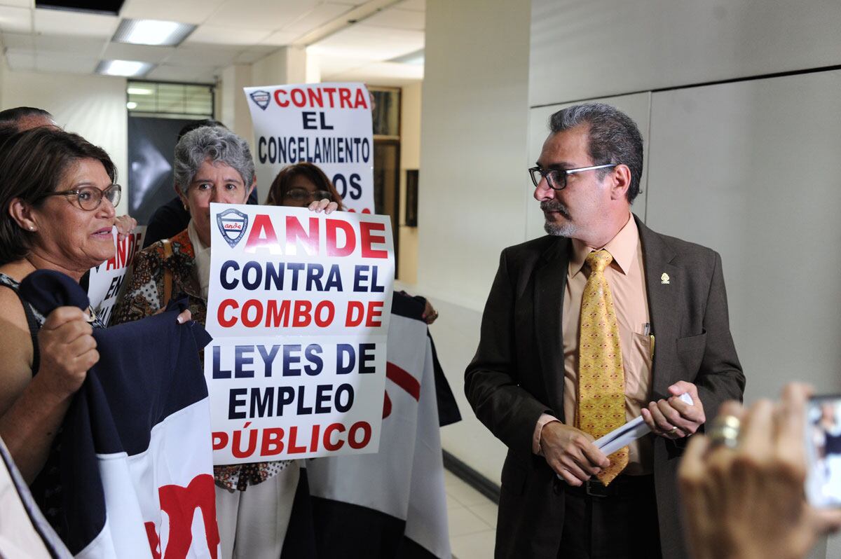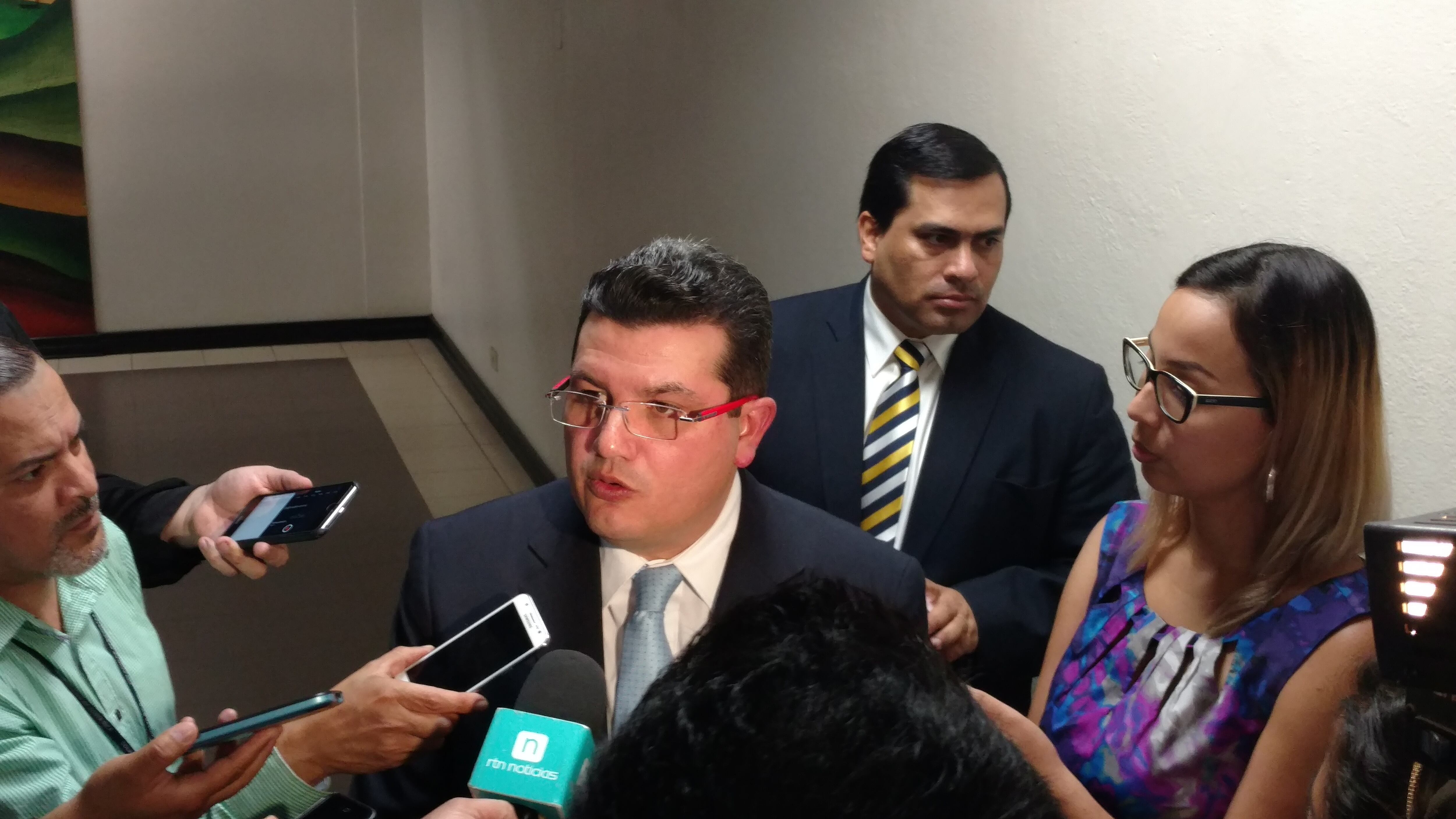 El ministro de la Presidencia, Sergio Alfaro, ofrece declaraciones en la Asamblea Legislativa sobre sus críticas al plan de empleo público. Detrás de él, el viceministro de Hacienda, José Francisco Pacheco. (Luis Navarro)
