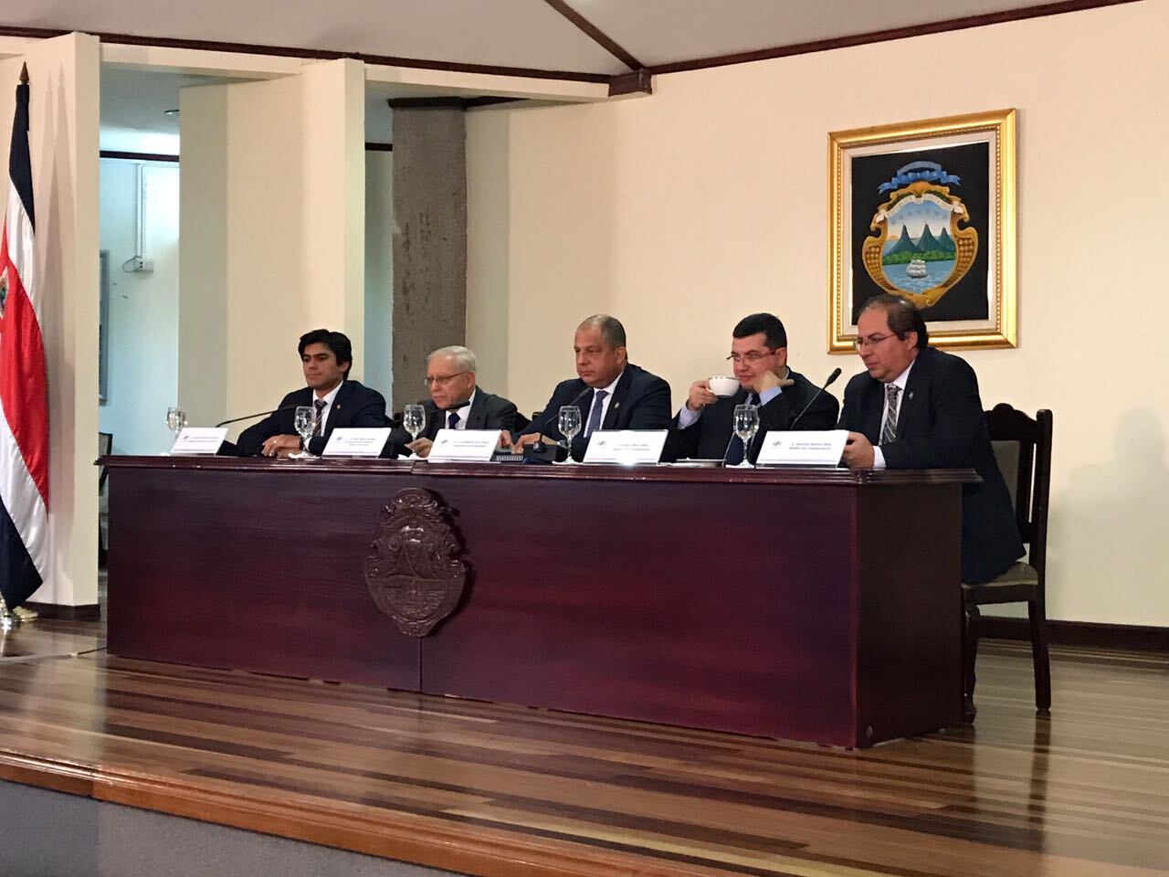 El presidente Luis Guillermo Solís junto con los ministros Germán Valverde (Transportes), Helio Fallas (Hacienda), Sergio Alfaro (Presidencia) y Mauricio Herrera (Comunicación). (Gerardo Ruiz)