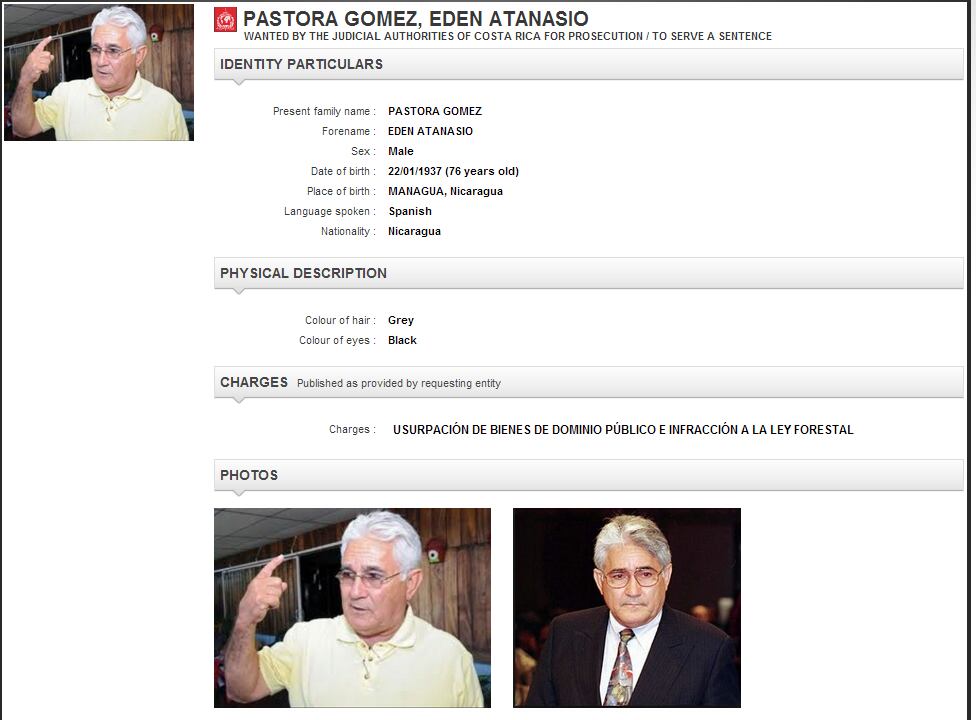 Según datos de la página web de Interpol, Costa Rica planteó esta búsqueda internacional para llevar a juicio a Pastora por estos delitos.