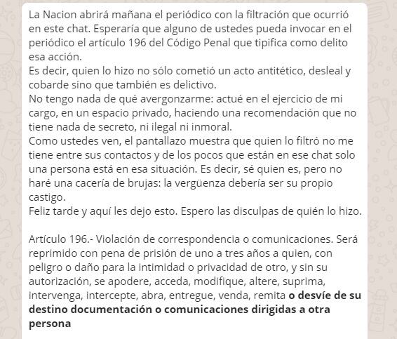 “ La Nación abrirá mañana (hoy) el periódico con la filtración que ocurrió en este chat. Esperaría que alguno de ustedes pueda invocar en el periódico el artículo 196 del Código Penal que tipifica como delito esa acción”, alegó.