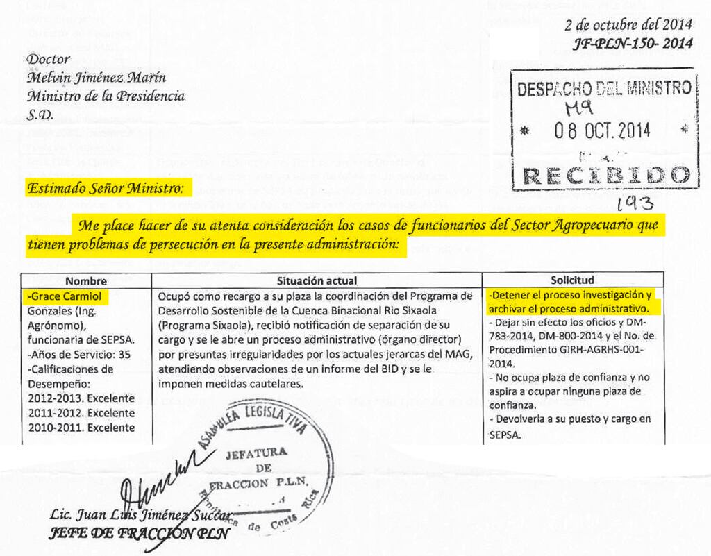 En la nota, con el oficio JF-PLN-150-2014, Jiménez asegura que los funcionarios aludidos son víctimas de persecución por no tener afinidad política con el actual gobierno.