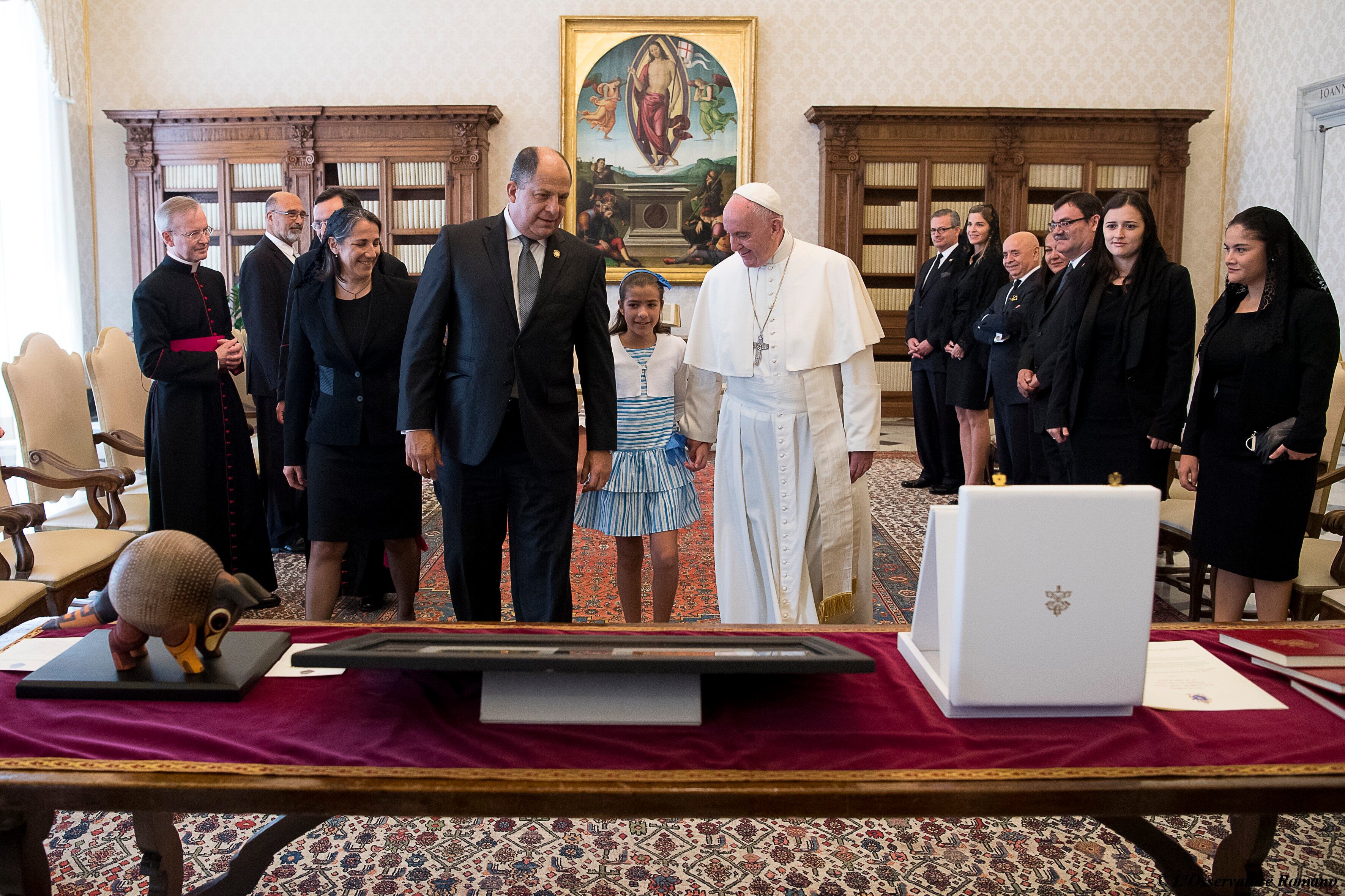 El papa Francisco recibió este viernes en la Santa Sede al presidente de la República, Luis Guillermo Solís, en una reunión en la que se trataron temas como el aborto, las migraciones y el narcotráfico.