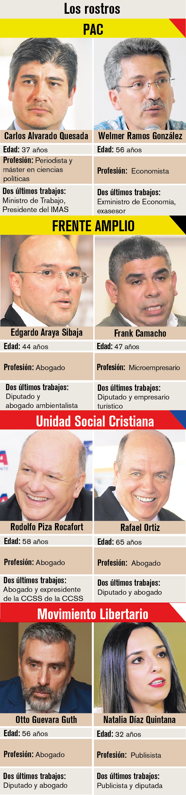 Los duelos son los siguientes: Carlos Alvarado y Welmer Ramos en Acción Ciudadana (PAC); Edgardo Araya y Frank Camacho en el Frente Amplio (FA), mientras en la Unidad Social Cristiana (PUSC) se enfrentan Rodolfo Piza y Rafael Ortiz. Por último, en el Movimiento Libertario (ML) aparece la única mujer: Natalia Díaz, que trata de arrebatarle el liderazgo a Otto Guevara.