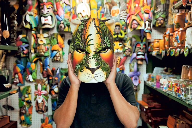 Él vende los granos de café cubiertos de chocolate artesanal. Hay también camisetas de la Sele , de Imperial y que repiten el “pura vida”. Hay cueros, maderas, llaveritos, hamacas, pulseras “a la carta” y máscaras borucas que pueden costar ¢95.000. También hay imágenes de El Quijote y una vendedora que tararea una canción de los ticos de Malpaís.
