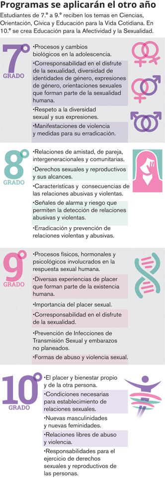 Las nuevas clases de sexualidad se impartirán a partir del 2018, dentro de Ciencias, Orientación y Educación Cívica en primaria y tercer ciclo y en una materia individual en cuarto año. Entre otros temas, en esos espacios se hablará sobre la diversidad de identidades de género, expresiones de género y las orientaciones sexuales; así como de respeto, manifestaciones y prevención de la violencia, derechos sexuales y reproductivos y prevención del embarazo.
