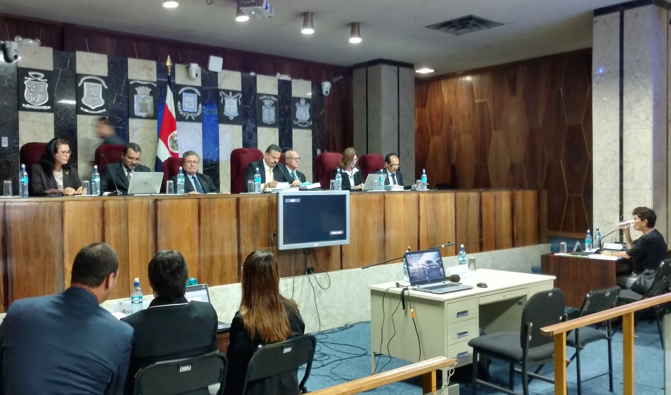 Vista esta mañana de la audiencia pública por dos recursos de amparo contra el libro Cocorí realizada en la Corte Suprema de Justicia. Abajo (de espalda; al centro), la defensora Monserrath Solano y a la derecha, la viceministra de Educación, Alicia Vargas. En el estrado, de izquierda a derecha, los magistrados Yerma Campos, Paul Rueda, Fernando Cruz, Ernesto Jinesta, Fernando Castillo, Nancy Hernández y José Paulino Hernández. (Juan Fernando Lara S.)