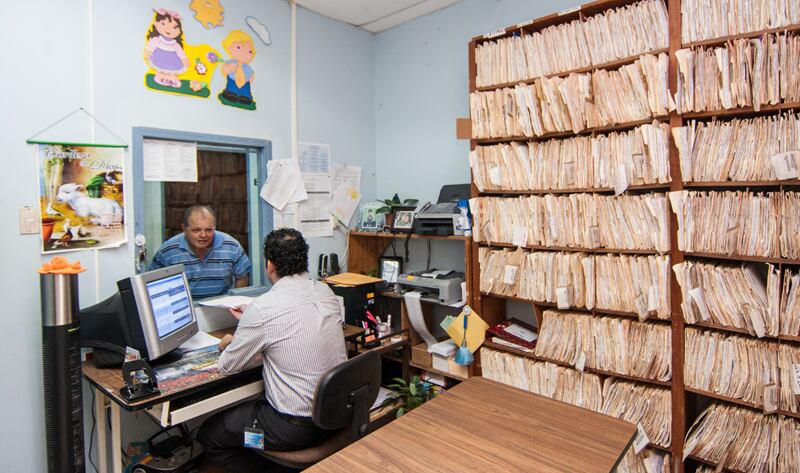 La médica Laura Mora atendió a Víctor Segura con una computadora sobre su escritorio y un grueso expediente de papel al lado.