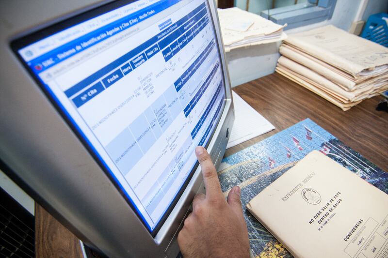 En la computadora, ingresó las observaciones sobre el estado de salud de su paciente. Para dar un diagnóstico y un tratamiento más certeros, Mora se vio obligada a revisar el expediente en papel porque aún no tiene acceso en línea a la información de exámenes médicos.