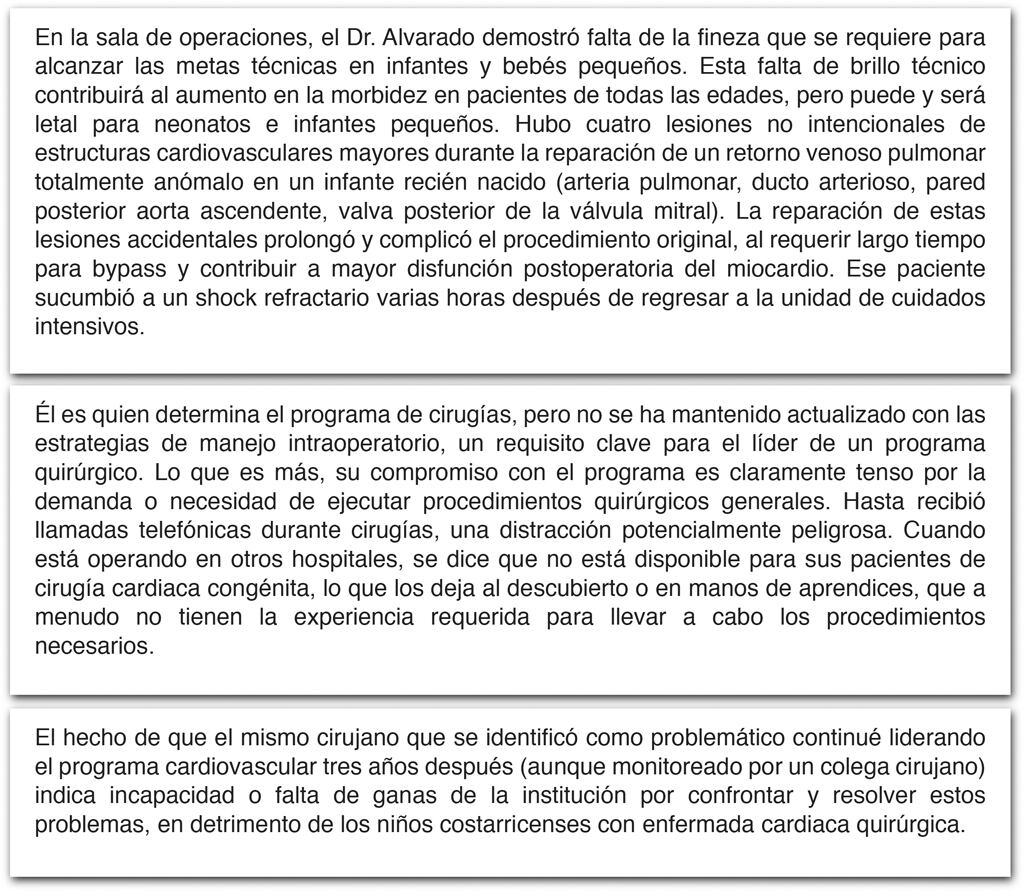 “El hecho de que el mismo cirujano –Alvarado– que se identificó como problemático continúe liderando el programa cardiovascular tres años después (aunque monitoreado por un colega cirujano), indica incapacidad o falta de ganas de la institución por confrontar y resolver estos problemas, en detrimento de los niños costarricenses con enfermedad cardíaca quirúrgica”, se lee en el informe.