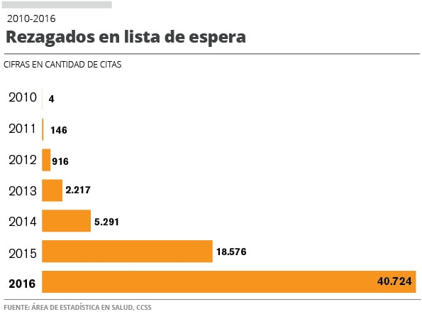 Los hospitales San Rafael de Alajuela y Escalante Pradilla son los que acumulan más casos rezagados entre 2010 y 2016, con un total de 12.971 y 9.201 pacientes, respectivamente.