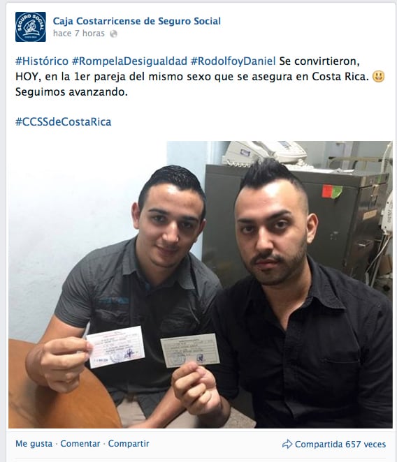 La posibilidad de que parejas homosexuales puedan asegurar a la persona compañera, como lo hacen los heterosexuales, fue parte de una reciente reforma al Reglamento del Seguro de Salud, el cual cubre los riesgos de enfermedad y maternidad. El cambio lo acordó la Junta Directiva de la CCSS en mayo pasado.