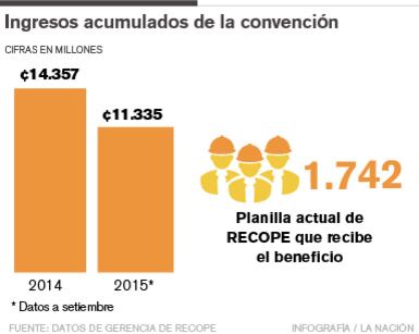 Entre otros beneficios, la convención colectiva alimenta un fondo de ahorro, sirve para otorgar préstamos, financiamiento para vivienda y recreación, así como servicio de restaurante, bono por mérito, por peligrosidad, censatía, servicio de transporte del personal, útiles escolares, materiales para organizar recepciones, becas para hijos de los trabajadores entre otros. También compra de medicinas que no tiene la Caja Costarricense del Seguro Social y diversos servicios de salud.