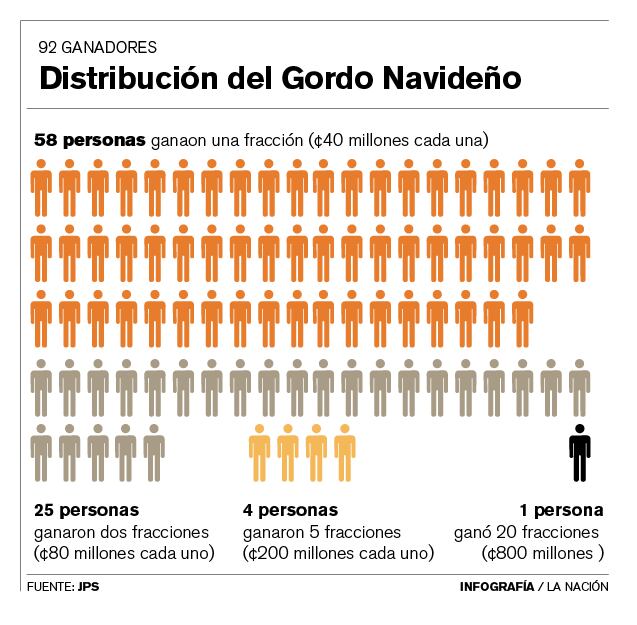 En total, 58 personas ganaron una fracción (¢40 millones cada una), 25 acudieron a cambiar dos fracciones (¢80 millones cada uno), cuatro personas ganaron cinco pedazos (¢200 millones cada una) y una persona medio entero (¢800 millones).
