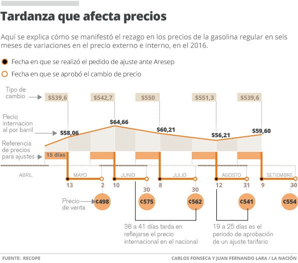 Esto quiere decir que hay una diferencia de 36 días entre el precio internacional y el que llega a los consumidores en Costa Rica. Durante ese tiempo, pueden darse más alzas y bajas externas, por lo que persistirá el rezago que deberá tomarse en cuenta en las solicitudes siguientes.