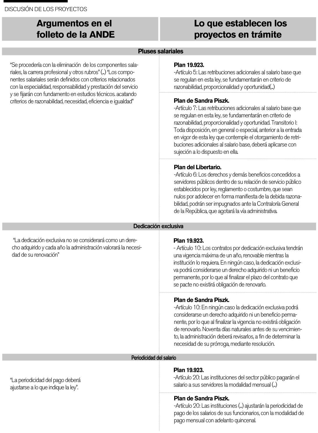 ¿Qué pasa con los pluses?. Una de las afirmaciones con que ANDE asusta a sus afiliados es que “todos (los proyectos) pretenden eliminar los componentes salariales para reducir el salario de la clase trabajadora”.