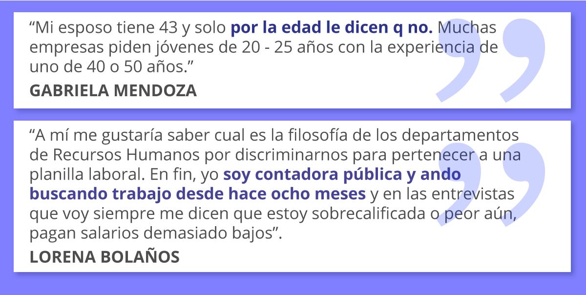 "Yo diría que la situación de la edad en la dinámica de trabajo obedece a un criterio de rendimiento y productividad más que otros elementos, como la experiencia y el conocimiento que la gente pueda tener. Es increíble que en nuestro país la gente de cierta edad en adelante no encuentre trabajo", manifestó Eduardo Gamboa, jefe del departamento de Recreación, Promoción y Asistencia Social al Trabajador del Ministerio de Trabajo.