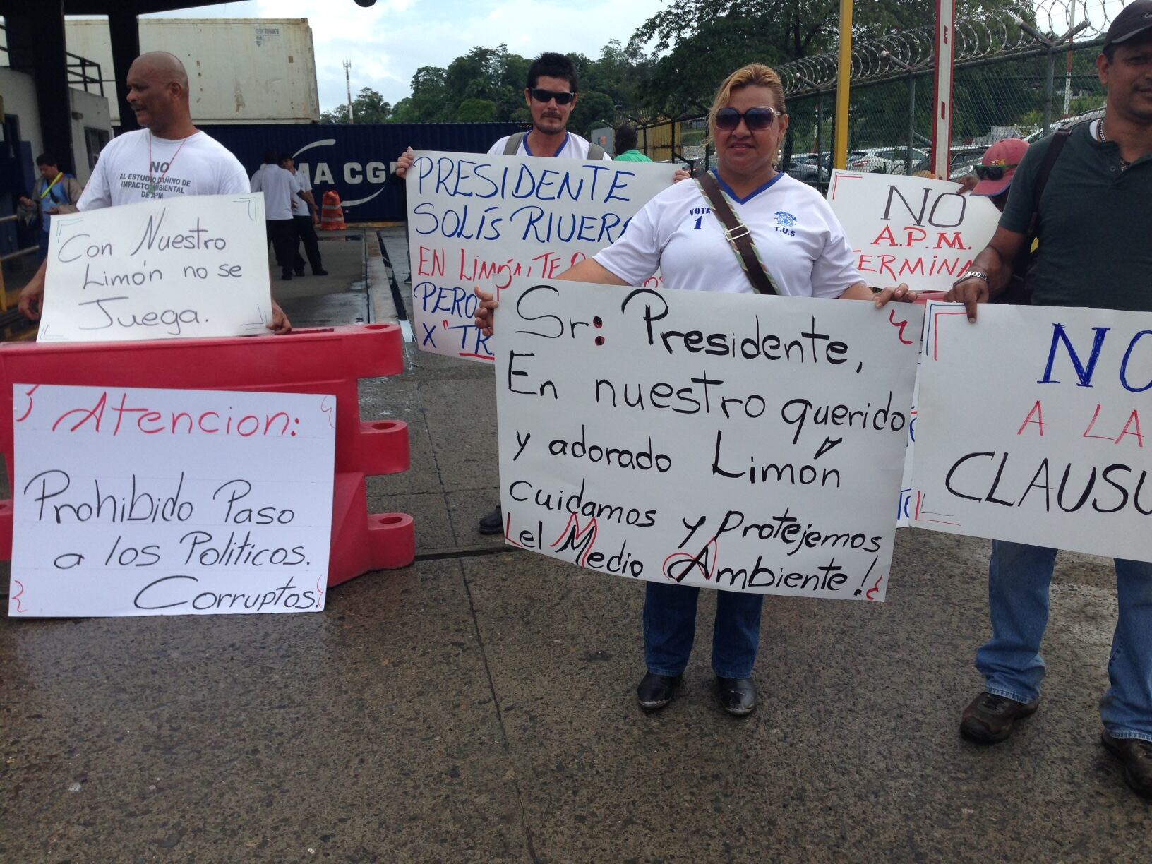 Un grupo de manifestantes de Sindicato de Trabajadores de Japdeva (Sintrajap) cerró el muelle de Moín como medida de protesta por las actividades de inauguración del megapuerto en la zona del Caribe.