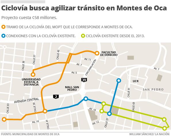 El centro de Montes de Oca contará con una ciclovía que se extenderá desde varios puntos del cantón hasta la Universidad de Costa Rica, al tiempo que se interconectará con el carril de bicicletas que el Ministerio de Obras Públicas y Transportes pretende construir desde La Sabana hasta la U.