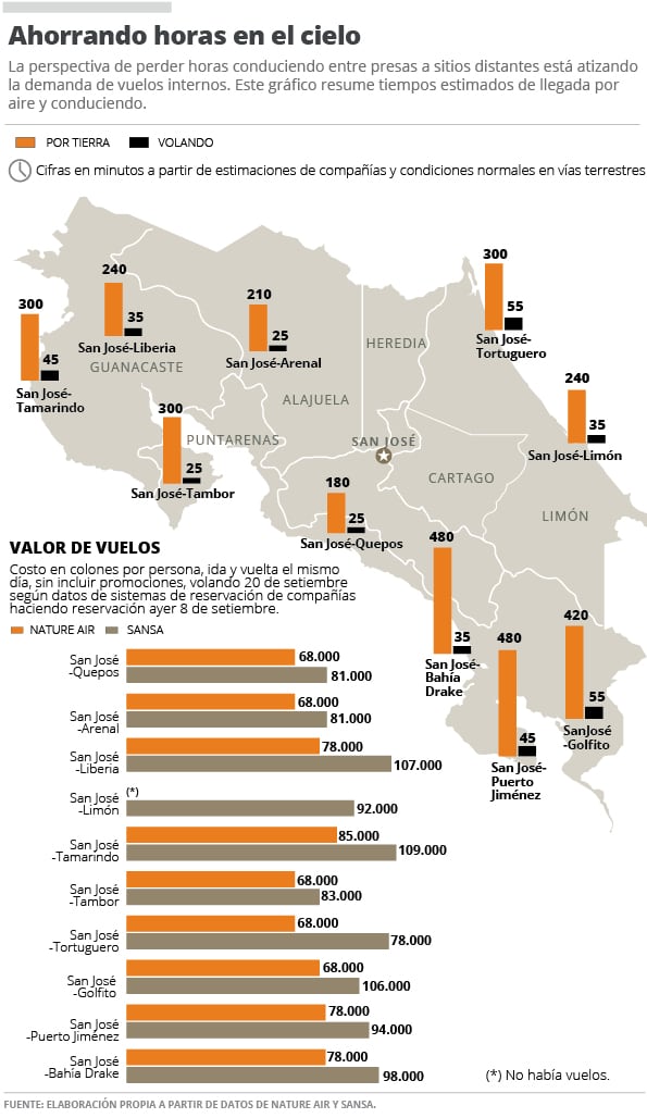 Voceros de Nature Air y Sansa afirman que el repunte obedece al caos vial y la mayor valoración del tiempo por parte de los pasajeros. En condiciones normales, viajar por tierra a Liberia (Guanacaste) dura cuatro horas y, por aire, un promedio de 35 minutos.