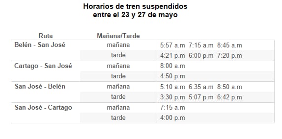 En el caso del servicio entre San José y Cartago se suspenderá un viaje a las 7:15 a. m. y otro a las 4 p. m. Sigue funcionando con normalidad el servicio a las 6:35 a. m., 7:35 a. m. 8:05 a. m., 3:30 p. m., 4:30 p. m., 5 p. m., 5:30 p. m., 6 p. m., 6:30 p. m., 7: p. m. y 7:30 p. m.
