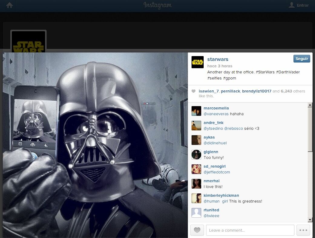 Con ese pie de foto compartió Darth Vader la primera imagen que se publicó en el perfil oficial de Star Wars en Instagram, recién creado este lunes.