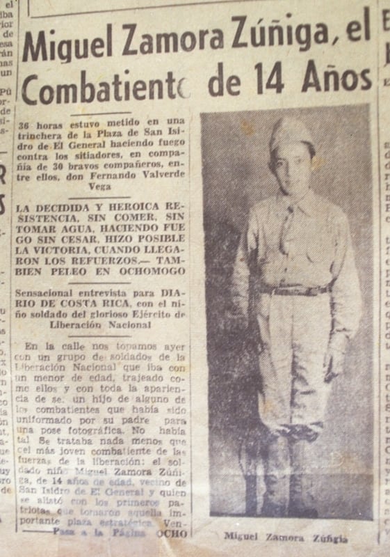 Yo participé en la revolución del 48 con un bautismo de fuego de 36 horas en las trincheras de San Isidro de El General. Tenía 14 años, al principio no me querían dar arma, pero no les quedó más remedio porque yo sabía disparar un riflecillo de cacería. Fui soldado de la revolución hasta que en Ochomogo se libró el último combate entre los pocos que llegamos a Ochomogo.
