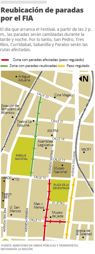 El día que arranca el Festival a partir de las 2 p. m. las paradas serán cambiadas durante la tarde y noche. Por lo tanto, San Pedro, Tres Ríos, Curridabat, Sabanilla y Paraíso se ubicarán en avenida primera y avenida central, entre Calle 15 y Calle 23.