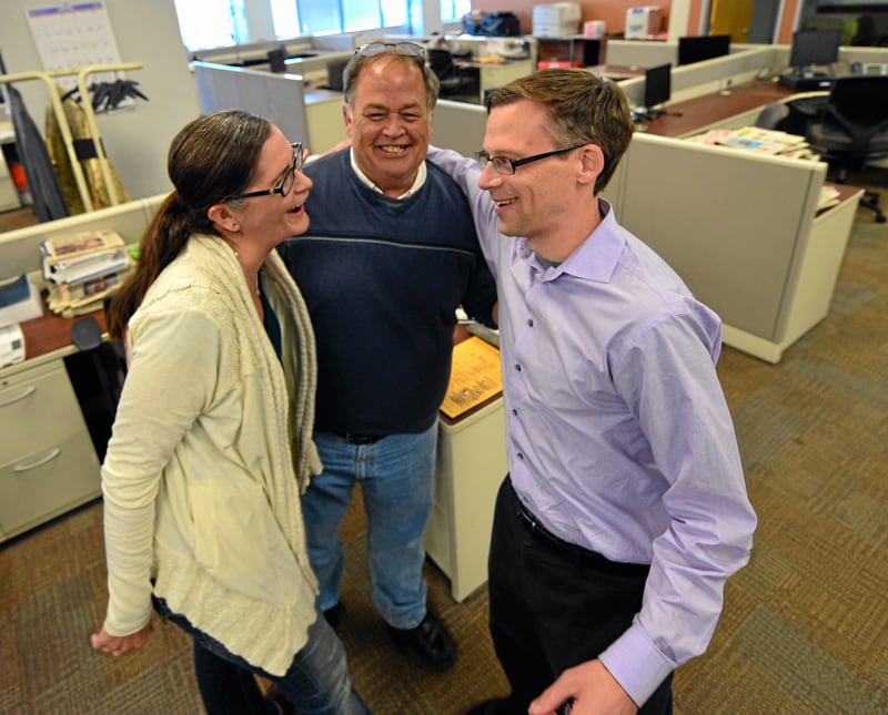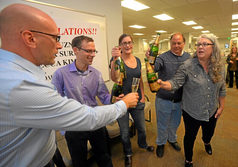 Sus amigos del Tico Times aseguran que Rebecca Kimitch es una excelente profesional, una persona simpática y que siempre piensa en los demás. Aquí con su equipo celebrando. | AP (Scott Varley)