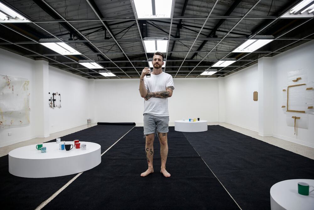 La exposición que exhibe este jueves se titula Herencias , y expone tazas de galerías que recogió al rededor del mundo, y expone plásticos de burbujas que se usaron para cubrir obras de artistas famosos.