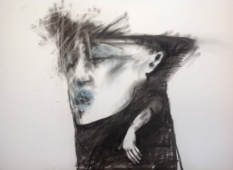 La furia. Las obras no tienen título; todas se hicieron al carboncillo, pero algunas exhiben toques de un color levemente azul. “Quise que emitieran señales de cadáver en vida”, confiesa Zumbado. Recordemos que “cianuro” deriva de “kyanos”: “azul” (en griego) porque los envenenados con cianuro exhiben la piel azulada.