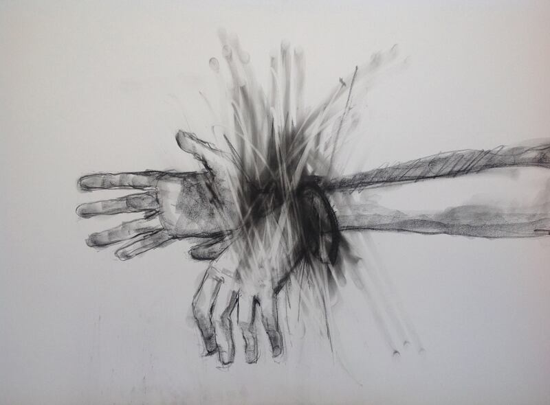 T rece veces nos sitia el retrato silencioso de la angustia. Las caras se esconden tras borrones furiosos. Los esquivos personajes estiran las manos esposadas, y no sabemos si nos piden el perdón o la muerte.