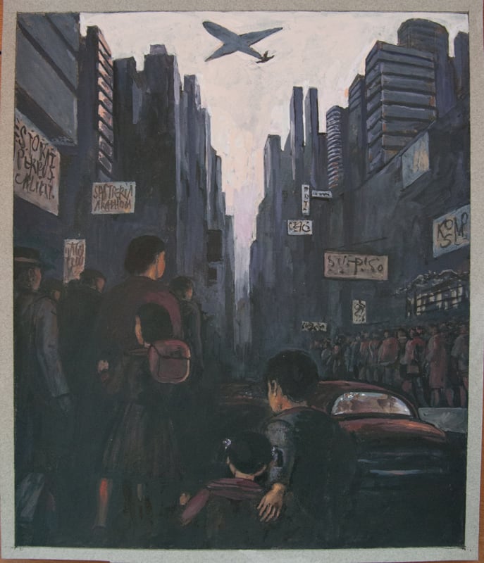 Un mono pinta un cuadro: “Es una tradición en algunos pintores, como en Bruegel: una sátira del artista sobre su labor”, recuerda don Julio. Aviones y otras máquinas dibujan el mundo moderno, como de ciencia-ficción: he aquí un Blade Runner obscuro y tumultuoso.