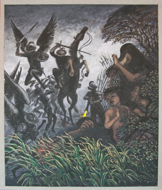 Sí, los tonos son obscuros, pero a veces brilla una luz, como en la obra que presenta la marcación (como una res) de un indígena por un conquistador, y como otro conquistador –en otro cuadro–, quien usa una linterna en la plena obscuridad de la témpera y la noche.