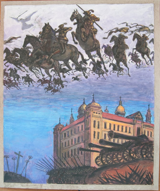 Una caballería fantástica y salvaje enturbia el cielo cual una bandada de rapiña; ha surgido de un castillo habitado de templos y protegido por cañones y lanceros. Los colores apagados son un rumor de pesadilla que resuena en una de las admirables Visiones de Julio Escámez.