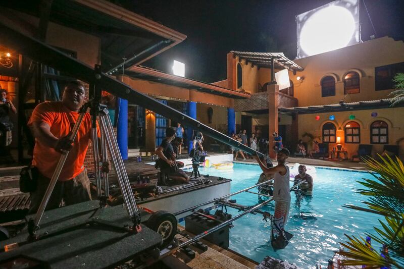 Aunque su sugerencia pareció exagerada, nunca sobra cuando una luz gigante se posa sobre la azotea, un riel de cámara recorre la piscina, mil cables rodean los pasillos y un par de extintores son manipulados en la cocina.