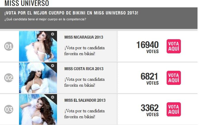 En otro sondeo en la misma página web, sobre el mejor cuerpo del concurso, Nicaragua está en el primer lugar y Costa Rica en segundo puesto.