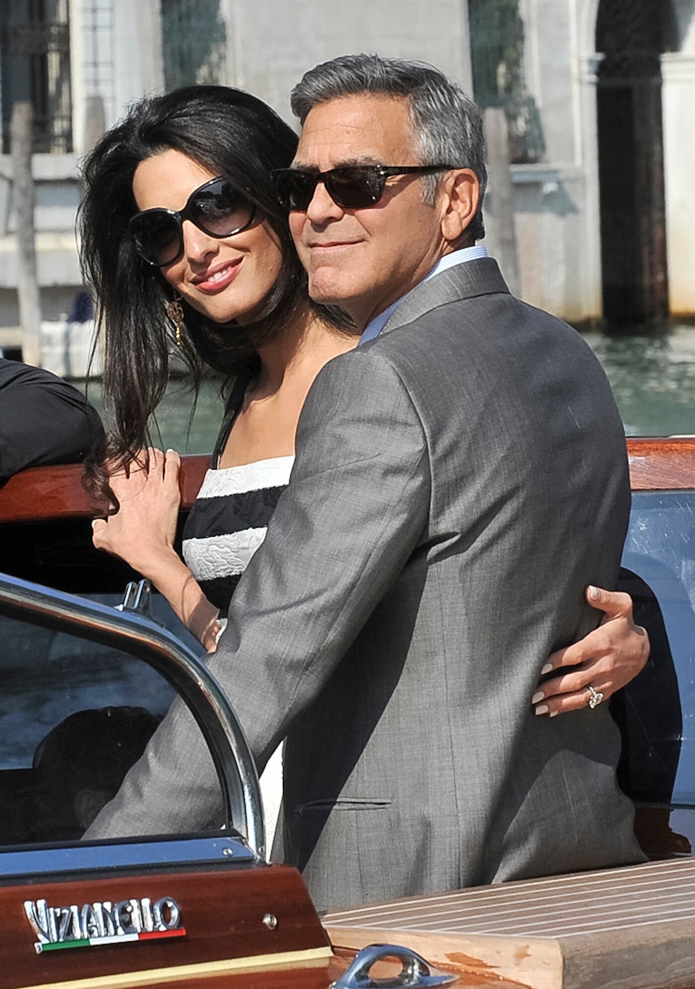 Personal del hotel en el lujoso hotel Cipriani formó una barrera de protección para proteger a Clooney y sus invitados, pero aun así el actor mandó algunos saludos con la mano.