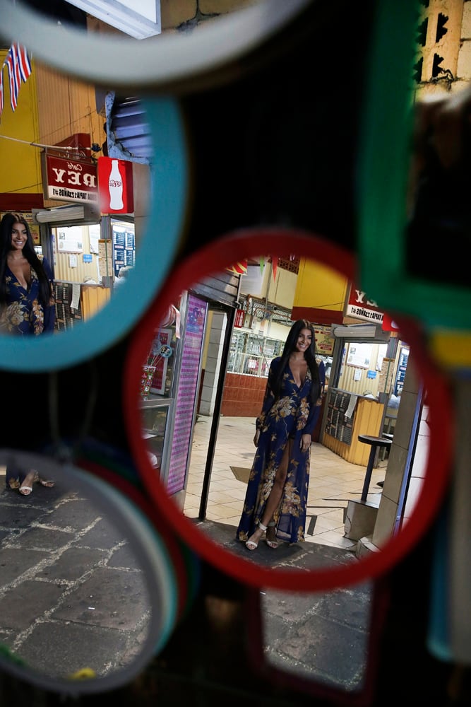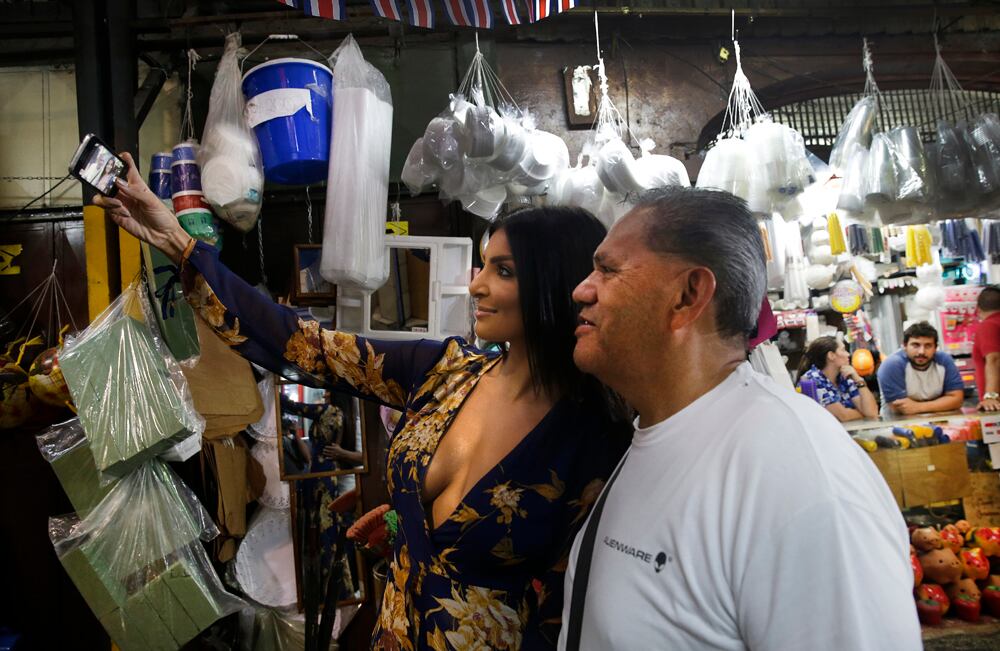 En pocos minutos, Jalé cosechó piropos, firmó autógrafos, se tomó selfis y hasta provocó algunas discusiones de parejas, todo por las miradas que atrajo mientras recorría los pasillos del popular mercado capitalino, en algunos de los cuales posó para las fotografías que acompañan este trabajo.