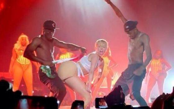 Durante el recital, uno de los bailarines de Cyrus usó la bandera mexicana para azotar el trasero de la artista, mientras esta parodiaba a Nicki Minaj y bailar como lo hace la rapera en el tema Anaconda.