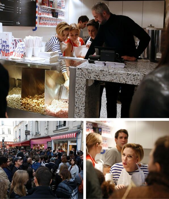 La actriz estadounidense Scarlett Johansson se situó detrás del mostrador de su tienda de palomitas de maíz gourmet de París, inaugurada este sábado, y jugó el papel de dependienta por un día.