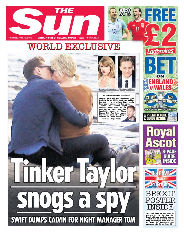 Este miércoles, las fotografías de la pareja aparecieron en la portada del diario The Sun. En ellas, se aprecia a Swift y a Hiddleston tomados de la mano, abrazados, tomándose selfies e incluso, besándose.