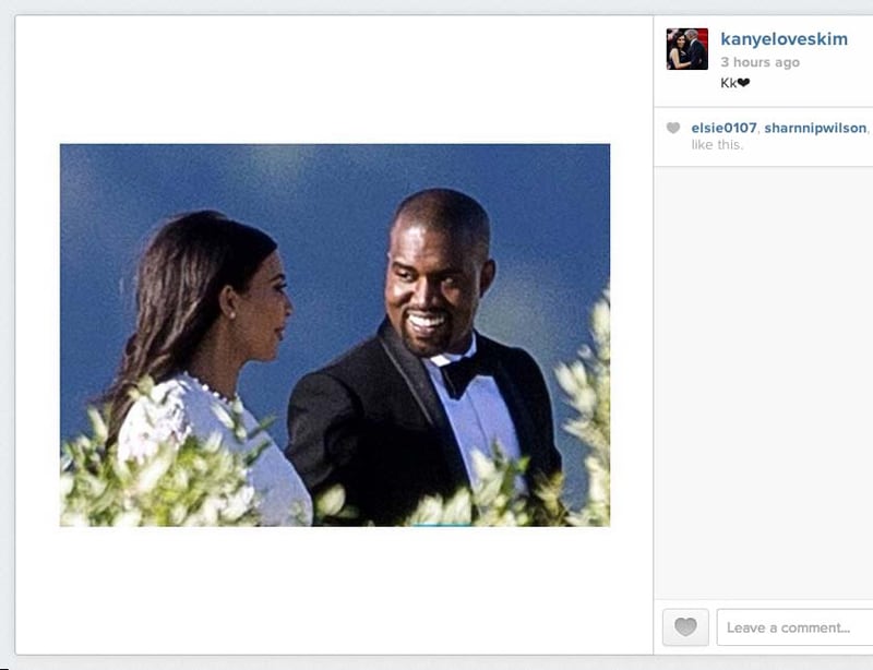 La cuenta @kanyeloveskim de Instagram publicó las imágenes. En una foto se aprecia a Kim con un vestido color blanco, de manga larga, con encajes y transparencias. Según informó la revista People este vestido fue confeccionado por Riccardo Tisci, director creativo de Givenchy.